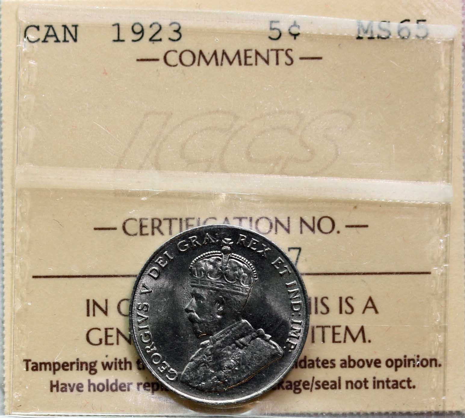 1923 5¢ ICCS Gem Mint State-65 Great lustre with nice surfaces. Scarce this nice.