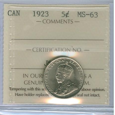 1923 5¢ ICCS MS63. Lustrous and well struck.