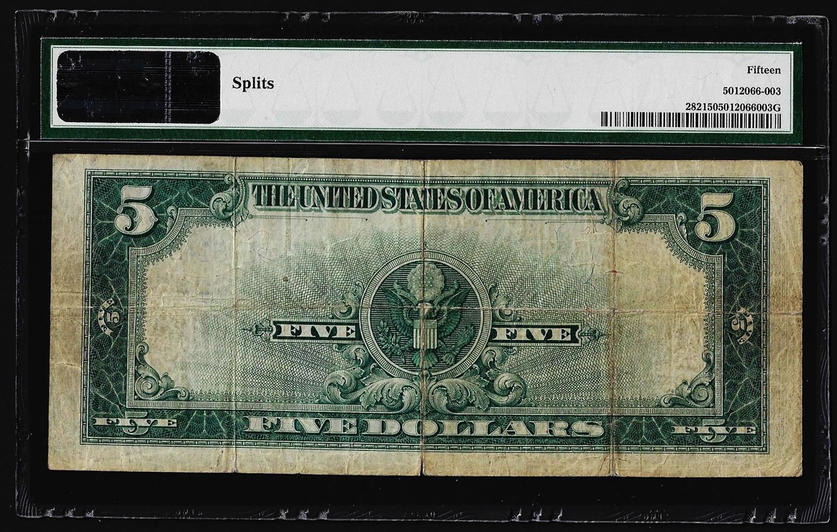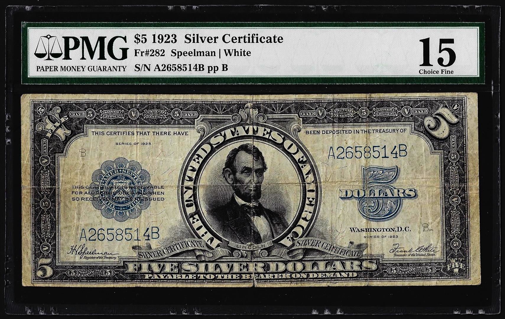 One 1923 $5 Porthole Silver Certificate Note Fr.282 PMG Choice Fine 15. PMG Certified.