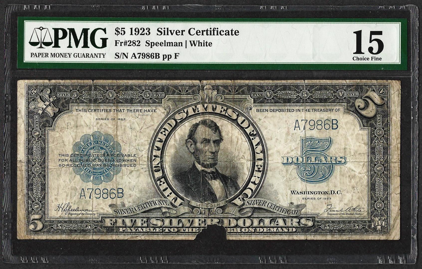 One 1923 $5 Porthole Silver Certificate Note Fr.282 PMG Choice Fine 15. PMG Certified.