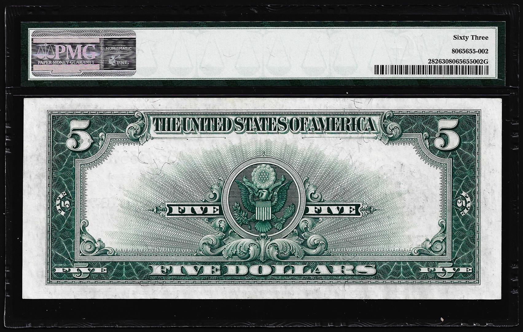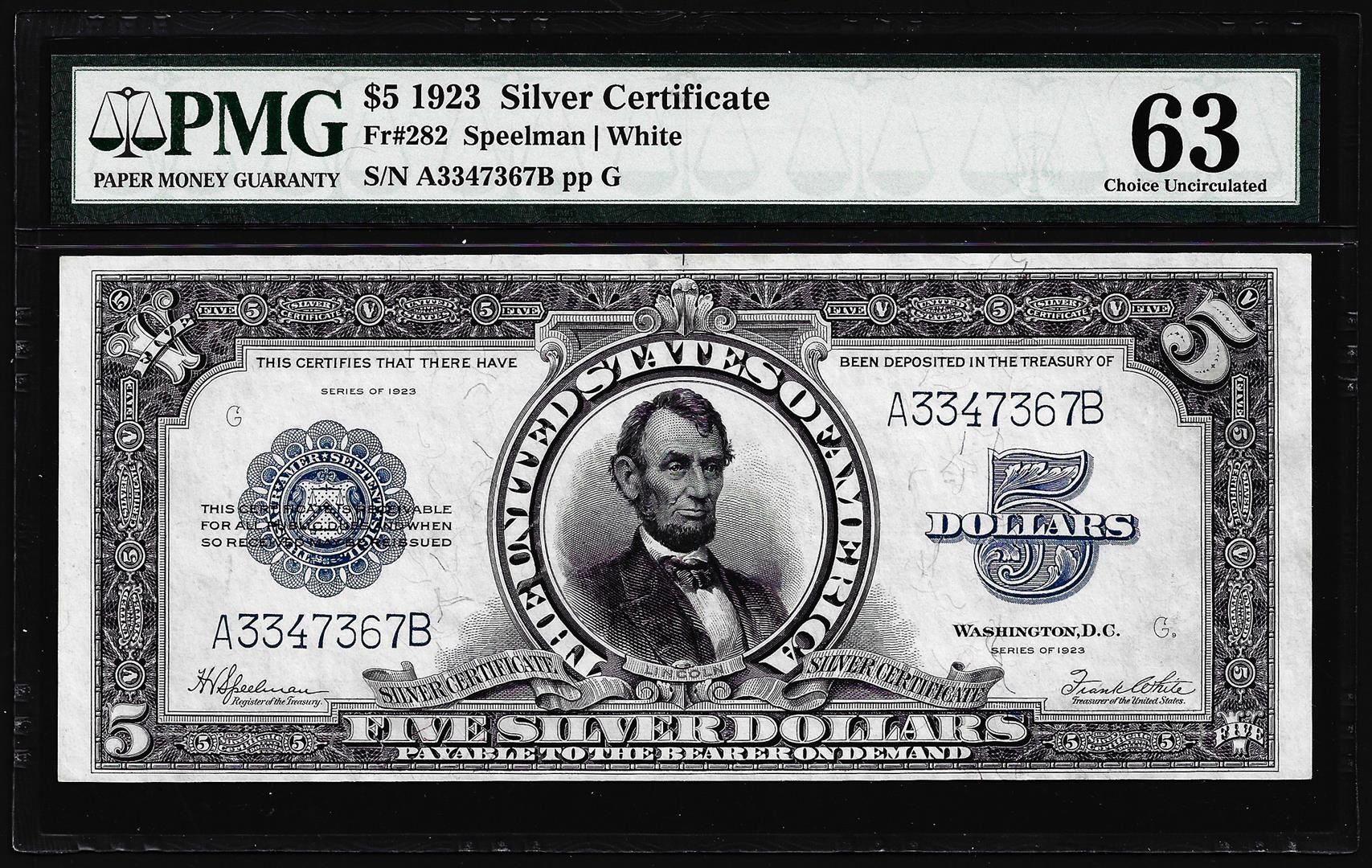 One 1923 $5 Porthole Silver Certificate Note Fr.282 PMG Choice Uncirculated 63. PMG Certified.