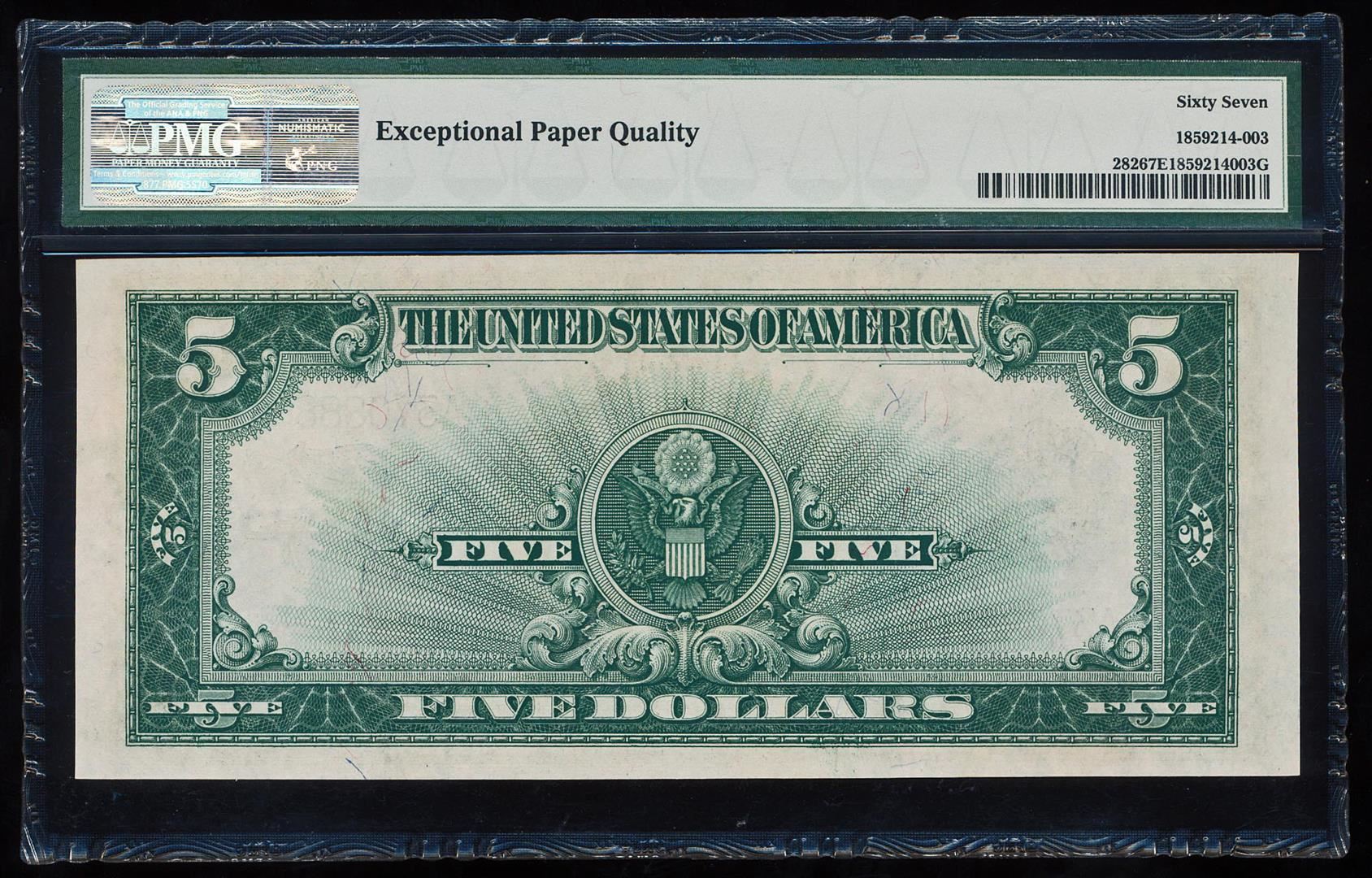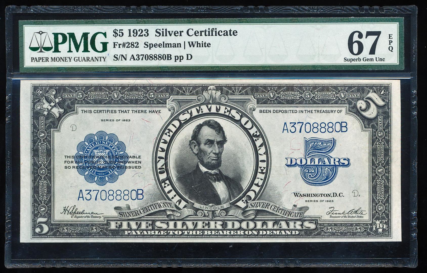 One 1923 $5 'Porthole' Silver Certificate Note Fr.282 PMG Superb Gem Uncirculated 67EPQ. PMG Certified.