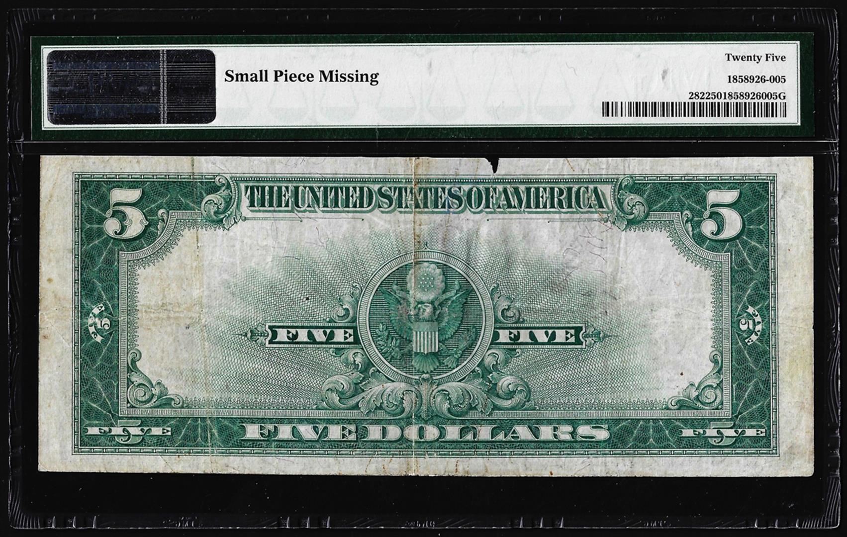 One 1923 $5 Porthole Silver Certificate Note Fr.282 PMG Very Fine 25. PMG Certified.