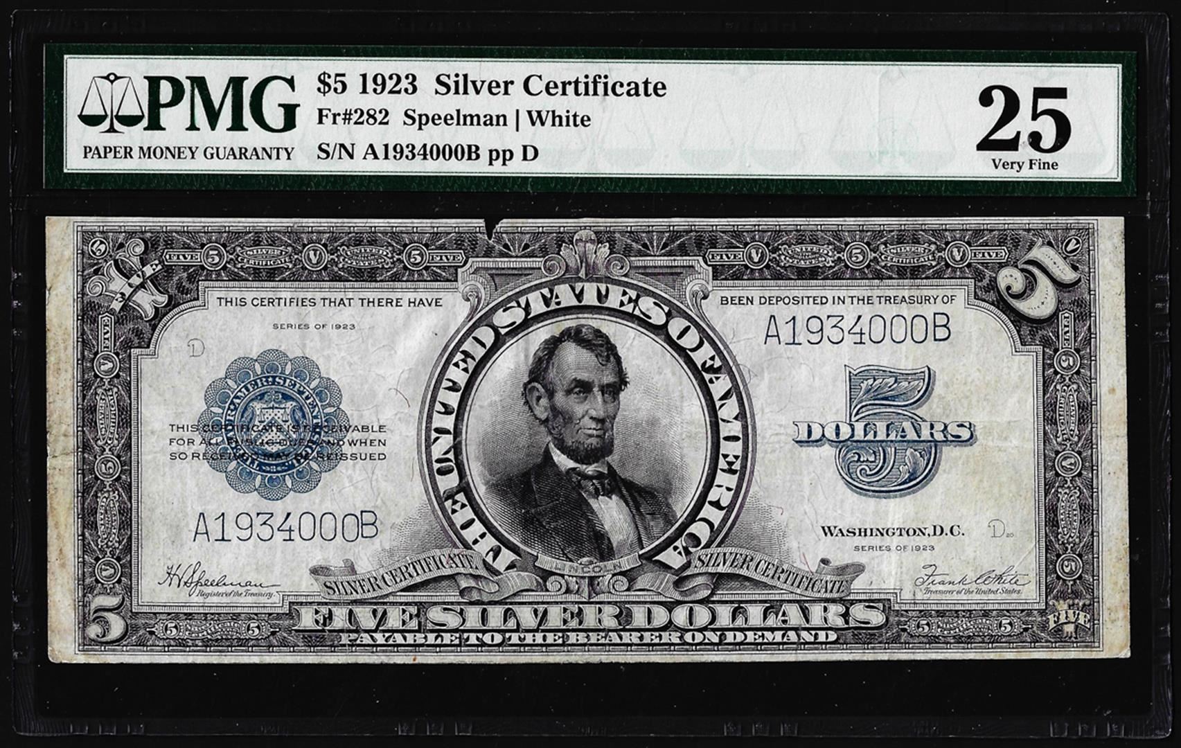 One 1923 $5 Porthole Silver Certificate Note Fr.282 PMG Very Fine 25. PMG Certified.