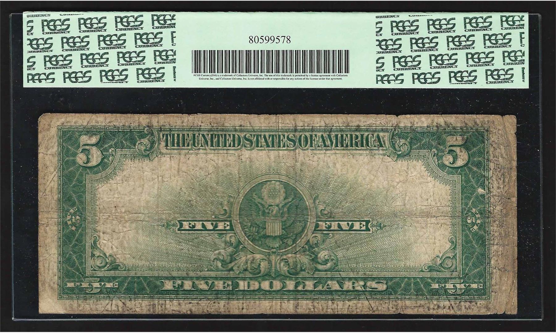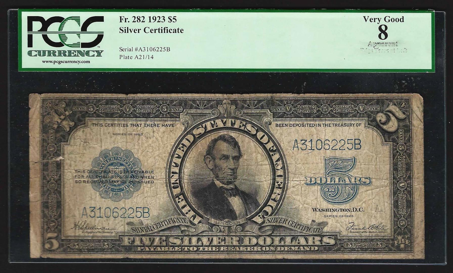 One 1923 $5 Porthole Silver Certificate Note PCGS Very Good 8 Apparent. PCGS Graded.