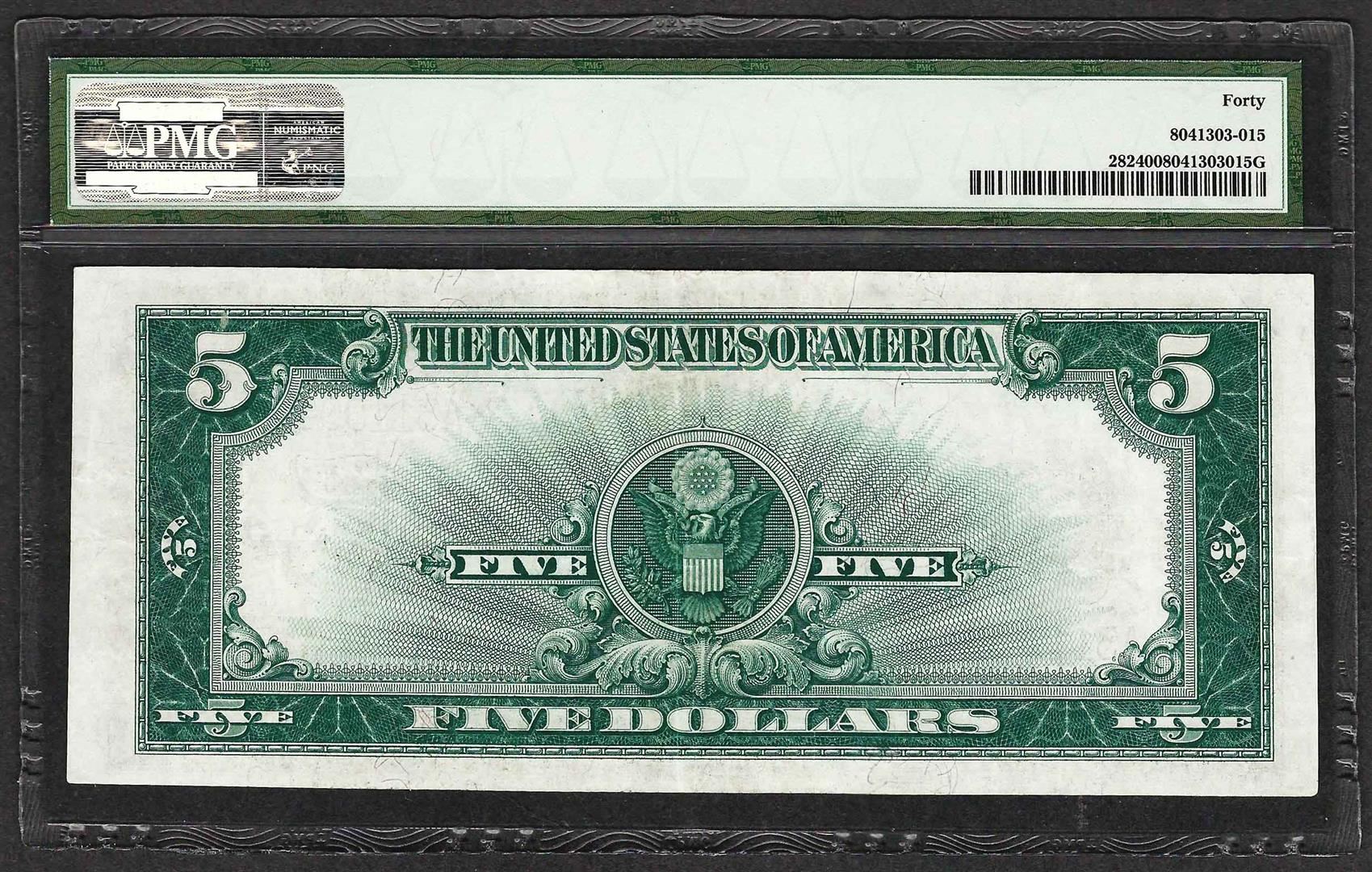 One 1923 $5 Porthole Silver Certificate Note PMG Extremely Fine 40. PMG Certified.