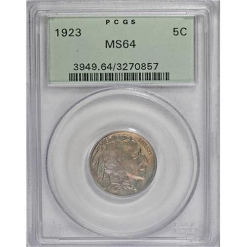 <B>1923 5C MS64 PCGS.</B></I> PCGS Population (420/383). NGC Census: (291/204). Mintage: 35,715,000. Numismedia Wsl. Price for NGC/PCGS coin in MS64: $144. (#3949)<BR><BR><B>Coin Engraver:</B> James E. Fraser<BR><BR><b>Shipping:</b> Coins & Currency (<a target="_blank" href="http://www.heritageauctions.com/common/shipping.php">view shipping information</a>)