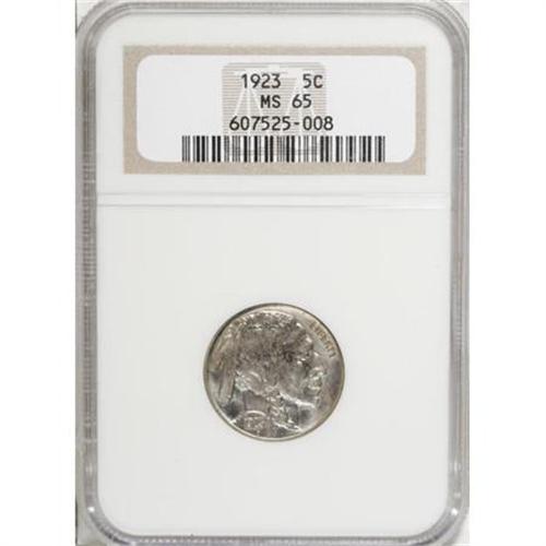<B>1923 5C MS65 NGC.</B></I> A solidly struck and luminous representative of this Philadelphia issue, struck a decade after the design's debut. Elements of green-gold haze appear over the ice-blue surfaces, with one such area evident to the right of the Indian's chin.<BR><BR><B>Coin Engraver:</B> James E. Fraser<BR><BR><b>Shipping:</b> Coins & Currency (<a target="_blank" href="http://www.heritageauctions.com/common/shipping.php">view shipping information</a>)