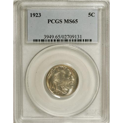 <B>1923 5C MS65 PCGS.</B></I> PCGS Population (240/113). NGC Census: (154/49). Mintage: 35,715,000. Numismedia Wsl. Price for NGC/PCGS coin in MS65: $535. (#3949)<BR><BR><b>Shipping:</b> Coins & Currency (<a target="_blank" href="http://www.heritageauctions.com/common/shipping.php">view shipping information</a>)