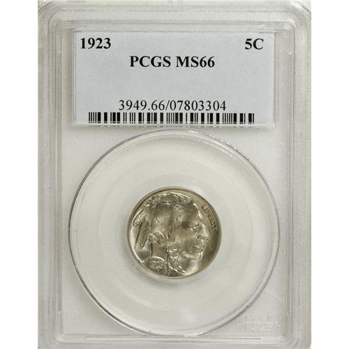 <B>1923 5C MS66 PCGS.</B></I> Fully brilliant light gray surfaces bring out the mint frost on this Premium Gem. A slight trace of champagne toning on the reverse provides additional eye appeal. The design details are extremely sharp. Just nine finer examples of this issue have been graded by PCGS (4/07).<BR><BR><b>Shipping:</b> Coins & Currency (<a target="_blank" href="http://www.heritageauctions.com/common/shipping.php">view shipping information</a>)