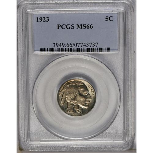 <B>1923<5C> MS66 PCGS.</B></I> This exquisitely struck Premium Gem has delicate gold and lime toning. Minute flyspecks are only evident beneath a glass. Although the 1923 is a high mintage issue, it is unexpectedly scarce in better Uncirculated grades. Population: 96 in 66, 8 finer (6/06).