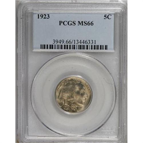 <B>1923 5C MS66 PCGS.</B></I> The contrast between the nickel-blue and gold-green elements on the obverse intensifies on the reverse. Well-defined for this Philadelphia issue with delightful, swirling luster. PCGS has graded only nine coins finer (8/07).<BR><BR><B>Coin Engraver:</B> James E. Fraser<BR><BR><b>Shipping:</b> Coins & Currency (<a target="_blank" href="http://www.heritageauctions.com/common/shipping.php">view shipping information</a>)