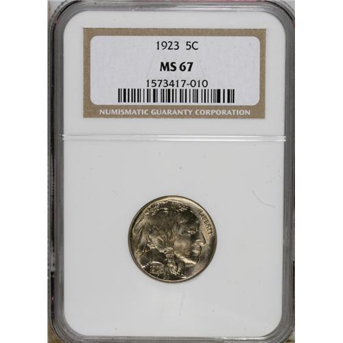 <B>1923 5C MS67 NGC.</B></I> This is an amazing Superb Gem specimen with sharply detailed obverse and reverse design elements. Both sides are fully brilliant and lustrous with frosty light gray surfaces and hints of pale gold toning. This piece is tied for the finest certified by either NGC or PCGS. Census: 9 in 67, 0 finer (4/07).<BR><BR><b>Shipping:</b> Coins & Currency (<a target="_blank" href="http://www.heritageauctions.com/common/shipping.php">view shipping information</a>)
