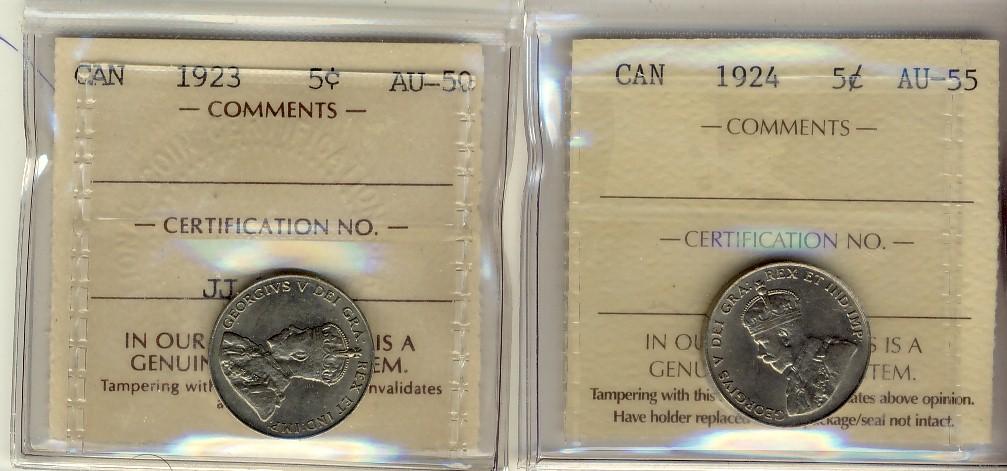 1923 AU50 & 1924 AU55 5¢. Lot of 2 ICCS graded coins.