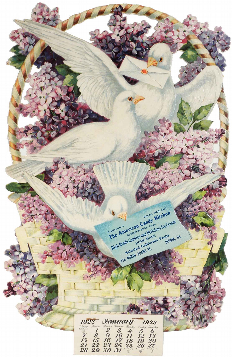 1923 Calendar Compliments of The American Candy Kitchen, Peoria, IL. Embossed, die cut cardboard with full pad. Framed under plexi glass. Insignificant tear at bottom left otherwise near mint condition. 10 3/4 X 15 1/2 w/o pad, image only.
