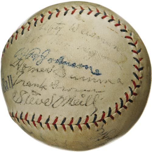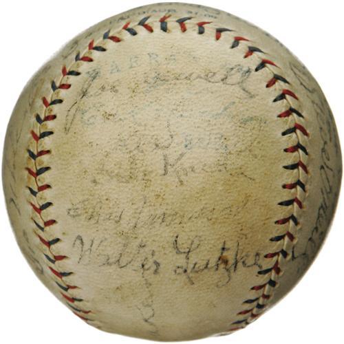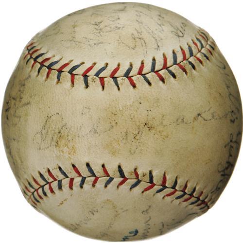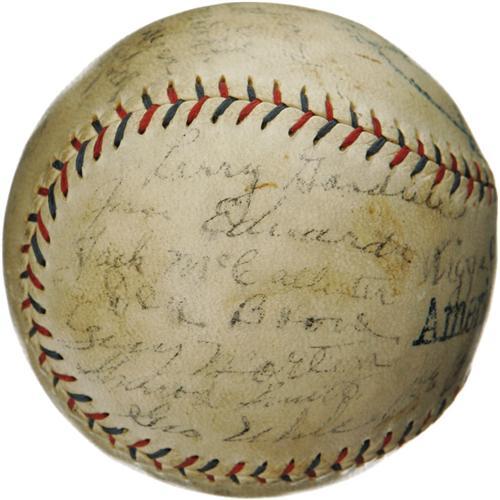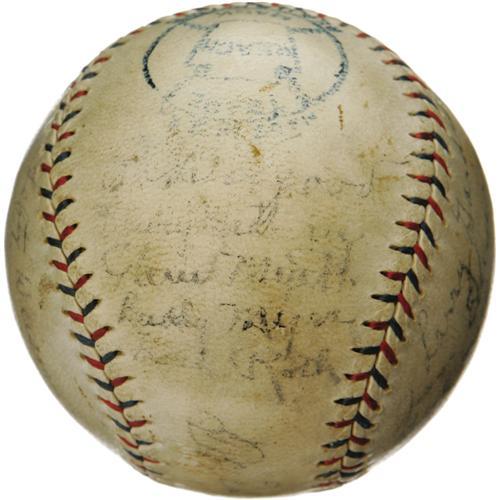 <B>1923 Cleveland Indians Team Signed Baseball.</B></I> Hall of Fame player/manager Tris Speaker assumes his appropriate sweet spot position on this OAL (Johnson) ball decorated with a Tribe of twenty-six. Fellow Hall of Famer Joe Sewell resides among the balance of signatures, with Wambsganss, Summa, Brower, Lutzke and more. Autograph quality ranges from the brink of oblivion to 8/10, with most falling near the 3/10 range. Speaker and Sewell, thankfully, are among the stronger examples. The ball itself is in nice shape, with the occasional area of toning causing no concern. <I>LOA from PSA/DNA. LOA from James Spence Authentication.</B></I><BR><BR><b>Shipping:</b> Balls, Pucks, etc., Small (<a target="_blank" href="http://www.heritageauctions.com/common/shipping.php">view shipping information</a>)