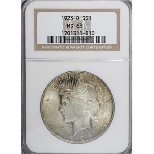 <B>1923-D $1 MS63 NGC.</B></I> . NGC Census: (684/1105). PCGS Population (1120/1567). Mintage: 6,811,000. Numismedia Wsl. Price for NGC/PCGS coin in MS63: $98. (#7361)<BR><BR><B>Coin Engraver:</B> Anthony de Francisci<BR><BR><b>Shipping:</b> Coins & Currency (<a target="_blank" href="http://www.heritageauctions.com/common/shipping.php">view shipping information</a>)