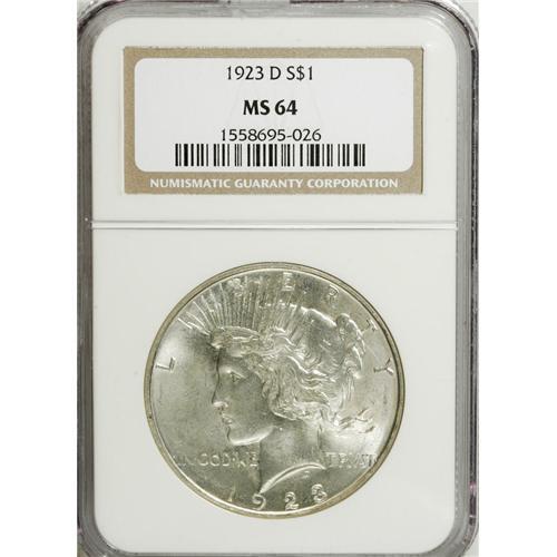 <B>1923-D $1 MS64 NGC.</B></I> NGC Census: (851/222). PCGS Population (0/0). Mintage: 6,811,000. Numismedia Wsl. Price for NGC/PCGS coin in MS64: $192. (#7361)<BR><BR><b>Shipping:</b> Coins & Currency (<a target="_blank" href="http://www.heritageauctions.com/common/shipping.php">view shipping information</a>)