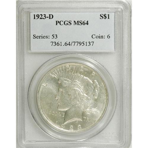 <B>1923-D $1 MS64 PCGS.</B></I> PCGS Population (1093/410). NGC Census: (845/219). Mintage: 6,811,000. Numismedia Wsl. Price: $192. (#7361)<BR><BR><b>Shipping:</b> Coins & Currency (<a target="_blank" href="http://www.heritageauctions.com/common/shipping.php">view shipping information</a>)