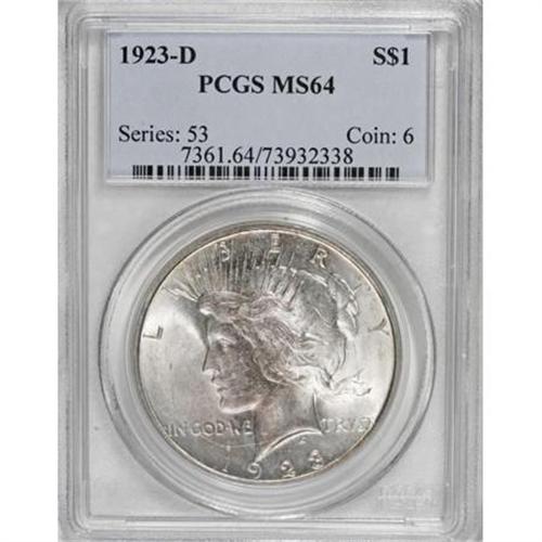 <B>1923-D $1 MS64 PCGS.</B></I> PCGS Population (1108/428). NGC Census: (869/226). Mintage: 6,811,000. Numismedia Wsl. Price for NGC/PCGS coin in MS64: $200. (#7361)<BR><BR><B>Coin Engraver:</B> Anthony de Francisci<BR><BR><b>Shipping:</b> Coins & Currency (<a target="_blank" href="http://www.heritageauctions.com/common/shipping.php">view shipping information</a>)