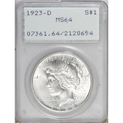 <B>1923-D $1 MS64 PCGS.</B></I> PCGS Population (1121/436). NGC Census: (874/225). Mintage: 6,811,000. Numismedia Wsl. Price for NGC/PCGS coin in MS64: $200. (#7361)<BR><BR><B>Coin Engraver:</B> Anthony de Francisci<BR><BR><b>Shipping:</b> Coins & Currency (<a target="_blank" href="http://www.heritageauctions.com/common/shipping.php">view shipping information</a>)