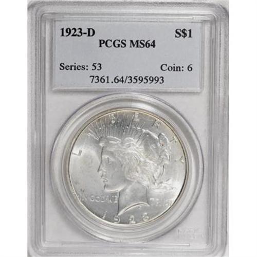 <B>1923-D $1 MS64 PCGS.</B></I> PCGS Population (1121/436). NGC Census: (874/225). Mintage: 6,811,000. Numismedia Wsl. Price for NGC/PCGS coin in MS64: $200. (#7361)<BR><BR><B>Coin Engraver:</B> Anthony de Francisci<BR><BR><b>Shipping:</b> Coins & Currency (<a target="_blank" href="http://www.heritageauctions.com/common/shipping.php">view shipping information</a>)