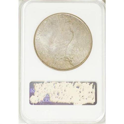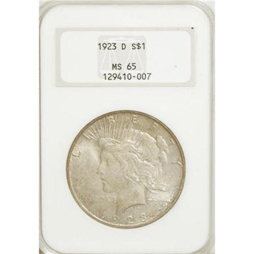 <B>1923-D $1 MS65 NGC.</B></I> Well struck and covered on both sides by mottled shades of olive, antique-gold, russet, and blue-green, among others. Satiny and well preserved, with remarkably few blemishes on either side. An interesting die crack extends from the obverse rim at 9 o'clock through the letter N of IN GOD. <BR><BR><B>Coin Engraver:</B> Anthony de Francisci<BR><BR><b>Shipping:</b> Coins & Currency (<a target="_blank" href="http://www.heritageauctions.com/common/shipping.php">view shipping information</a>)
