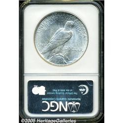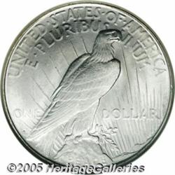 <B>1923-D<img border='0' src='http://www.heritagecoins.com/images/star.gif' width=10 height=10>$1 MS66 <img border='0' src='http://www.heritagecoins.com/images/star.gif' width=10 height=10> NGC.</B></I> This is an outstanding example with frosty silver luster and excellent eye appeal. The surfaces are pristine, being free of abrasions other than the tiniest of surface marks. This example, given the star designation by NGC for its impressive quality, is tied for the finest certified by this grading service. Similarly, PCGS has never graded a better example. Population: 19 in 66, 0 finer (2/05).