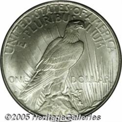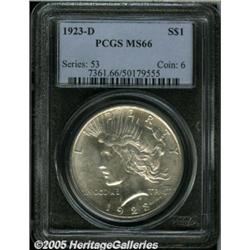 <B>1923-D<img border='0' src='http://www.heritagecoins.com/images/star.gif' width=10 height=10>$1 MS66 PCGS.</B></I> A stunning frosty-white specimen that combines an exactness of strike with near impeccable surface quality. Only the obligatory die breaks on the obverse gives this lovely Peace Dollar away as a Denver product, otherwise one might automatically assume it was of Philadelphia origin. One of the nicest 23-D Dollars we have recently offered and suitable for the finest Peace Dollar set. Population: 62 in 66, 0 finer (2/05).