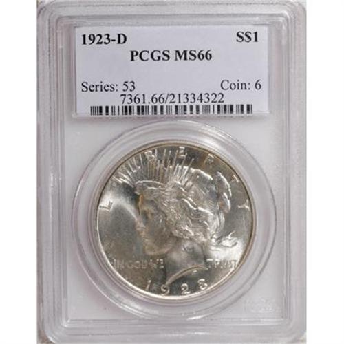 <B>1923-D $1 MS66 PCGS.</B></I> The second of just five D-mint issues in the series and one of the more difficult in Premium Gem condition despite a mintage that exceeds 6.8 million pieces. This shimmering, well defined example is untoned and boasts outstanding luster qualities. Only a few relatively insignificant blemishes are clustered on Liberty's neck. Population: 69 in 66, 0 finer (7/07).<I><BR>From The Arnold & Harriet Collection.</B></I><BR><BR><B>Coin Engraver:</B> Anthony de Francisci<BR><BR><b>Shipping:</b> Coins & Currency (<a target="_blank" href="http://www.heritageauctions.com/common/shipping.php">view shipping information</a>\)
