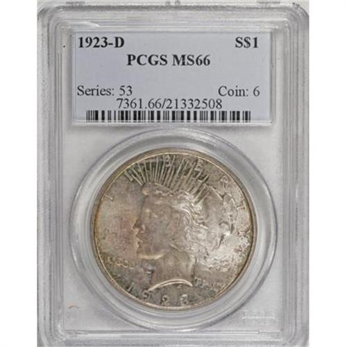 <B>1923-D $1 MS66 PCGS.</B></I> This is an incredible Peace dollar, tied for the finest '23-D that has been certified by either NGC or PCGS. Although PCGS reports a population of 70 coins at the MS66 grade level, this total must be reduced by an unknown number of resubmissions. The obverse has a thin veil of lilac, sea-green, and gold toning. The reverse is mostly brilliant with faint traces of pale gold.<BR><BR><B>Coin Engraver:</B> Anthony de Francisci<BR><BR><b>Shipping:</b> Coins & Currency (<a target="_blank" href="http://www.heritageauctions.com/common/shipping.php">view shipping information</a>)
