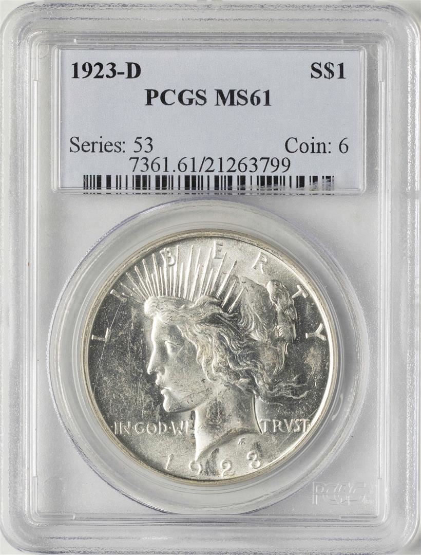 One 1923-D $1 Peace Silver Dollar Coin PCGS MS61. PCGS Graded.