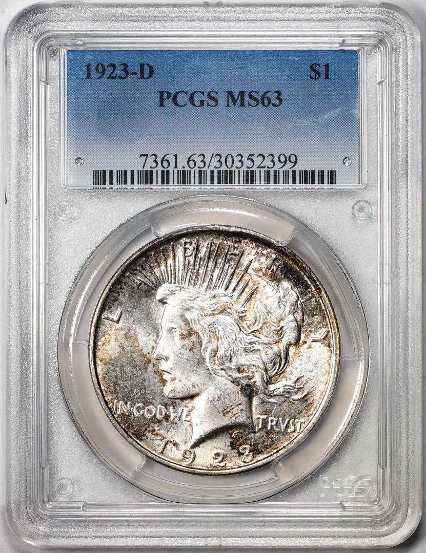 One 1923-D $1 Peace Silver Dollar Coin PCGS MS63 Nice Toning. PCGS Graded.