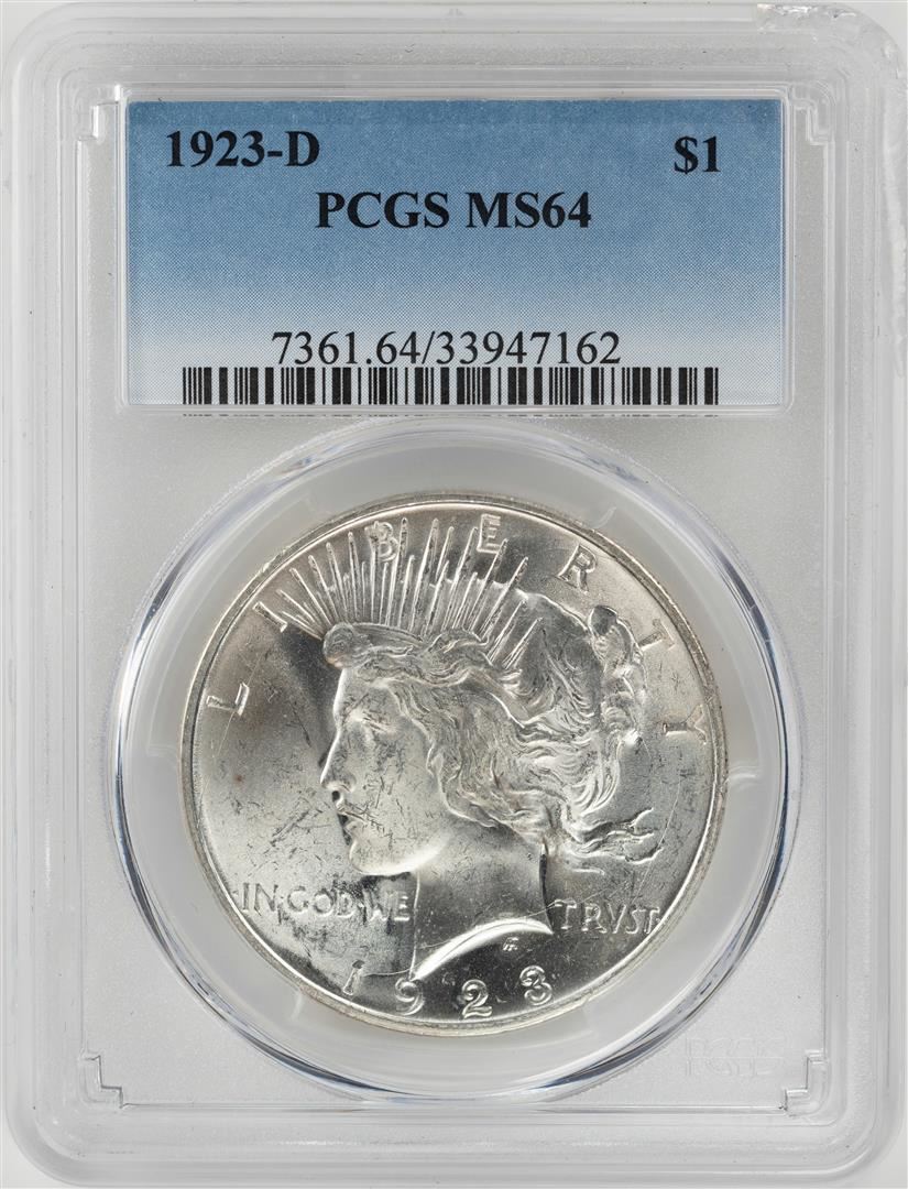 One 1923-D $1 Peace Silver Dollar Coin PCGS MS64. PCGS Graded.