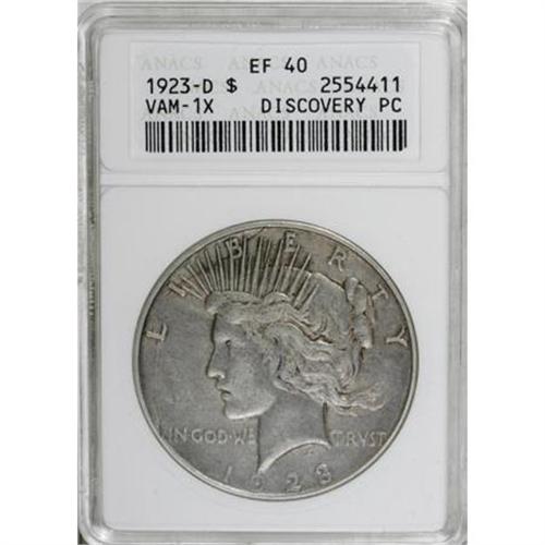 <B>1923-D $1 XF40 ANACS.</B></I> VAM-1X Discovery Piece. NGC Census: (4/2277). PCGS Population (3/3383). Mintage: 6,811,000. Numismedia Wsl. Price for NGC/PCGS coin in XF40: $13. (#7361)<BR><BR><B>Coin Engraver:</B> Anthony de Francisci<BR><BR><b>Shipping:</b> Coins & Currency (<a target="_blank" href="http://www.heritageauctions.com/common/shipping.php">view shipping information</a>)