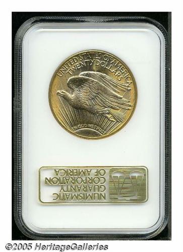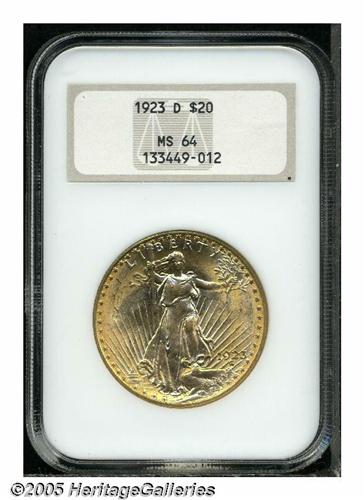<B>1923-D<$20> MS64 NGC.</B></I> Well struck with thick mint frost and glinting, highly lustrous surfaces that display lovely deep orange-gold and pale mint-green coloration. A handful of noticeable contact marks, and wispy luster grazes, on the obverse, prevent a higher grade.