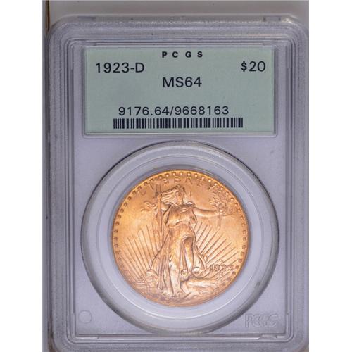 <B>1923-D<$20> MS64 PCGS.</B></I> Lustrous with generally clean fields and devices. A few abrasions, including one near the boldly detailed head of Liberty, keep this coin from Gem status. Housed in a green label holder.