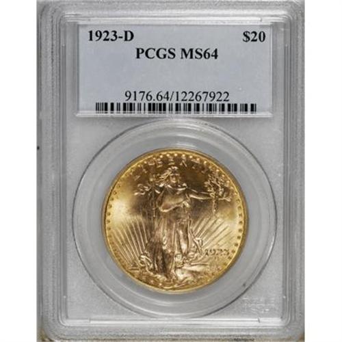 <B>1923-D $20 MS64 PCGS.</B></I> . PCGS Population (2276/3341). NGC Census: (1819/2441). Mintage: 1,702,250. Numismedia Wsl. Price for NGC/PCGS coin in MS64: $1,200. (#9176)<BR><BR><B>Coin Engraver:</B> Augustus Saint-Gaudens<BR><BR><b>Shipping:</b> Coins & Currency (<a target="_blank" href="http://www.heritageauctions.com/common/shipping.php">view shipping information</a>)