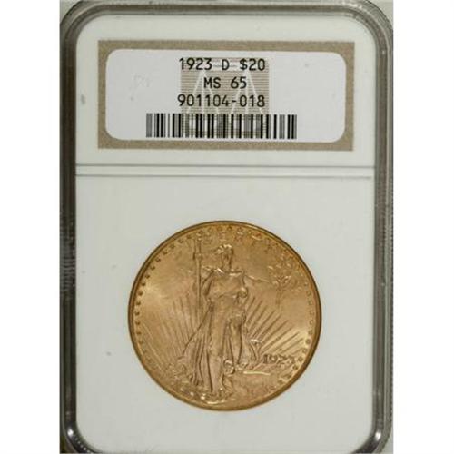 <B>1923-D $20 MS65 NGC.</B></I> A sharp strike is brought out by the intense orange-gold luster on both sides of this Gem. A few tiny surface chips are visible on the obverse.<BR><BR><b>Shipping:</b> Coins & Currency (<a target="_blank" href="http://www.heritageauctions.com/common/shipping.php">view shipping information</a>)
