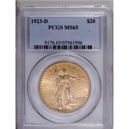 <B>1923-D<$20> MS65 PCGS.</B></I> A sharply struck example with excellent luster. This piece is beautifully preserved except for a moderate mark on Liberty's forehead.