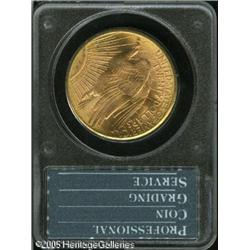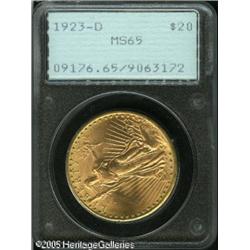 <B>1923-D $20 MS65 PCGS.</B></I> A well struck and lustrous peach-gold Gem. A couple of tiny ticks on the reverse do not distract. The 1923-D is the only common postwar Denver Mint issue. Certified in a first generation holder. Lot:9636