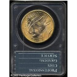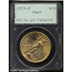 <B>1923-D $20 MS65 PCGS.</B></I> Certain coin issues are known for strike, others for luster quality, and still others for abrasions (or lack thereof). The '23-D Saint-Gaudens is best known for eye appeal. Think about it: have you ever seen an unattractive 1923-D? This one is no exception. Sharply struck with rich reddish patina and excellent luster characteristics--always a delight to view. Housed in a first-generation PCGS holder.<BR><I>Ex: 2001 FUN Signature Sale (Heritage 1/01).</B></I><BR><I>From The Richard J. Chouinard Collection of United States Coins, Part Two.</B></I> Lot:9633