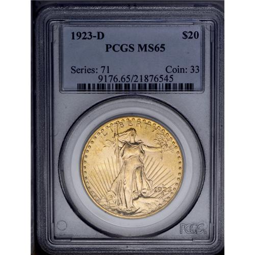 <B>1923-D<$20> MS65 PCGS.</B></I> One of the finest produced issues in the Saint-Gaudens series, this D-mint example has a sharp strike and showcases grandiose luster. A compelling example for someone looking to assemble a high-end type set. <BR><BR><B>Important notice:</B> Heritage usually auctions material at the rate of 200-250 lots per hour. On some occasions eBay Live bid software or the Internet may not be able to keep up with the pace of the auction. We recommend placing a realistic absentee bid now as insurance to avoid disappointment. Occasionally the auctioneer may eliminate or reject an eBay Live bid, and the auctioneer may also reopen a lot after the close of the eBay live bidding (usually because we missed an audience bid), and may reject your bid even if it shows you as the winning bidder. By bidding via eBay Live, you agree that Heritage may award the lot to another bidder at its sole discretion under the circumstances described above or any other reasonable circumstances. Since eBay bids are not shown to us until we open the lot on the floor, we treat those bids just like floor bids. In most cases the floor responds before the eBay bid is presented to us, due to Internet lag time, so for consistency we have made it a policy that floor bids are always considered first over tie eBay live bids. Also please note that all Heritage lots purchased through eBay Live carry a 20% Buyer's Premium. Please make sure you read the Terms and Conditions before you bid. This lot is being auctioned in conjunction with a live floor auction by Heritage Galleries & Auctioneers. All final auction and invoice information will be supplied by Heritage Galleries & Auctioneers, and all other information should be considered preliminary. Lot:4690 <BR><BR><B>Winning Notification and Billing:</B> After the FINAL session in this auction is complete, Heritage will send e-mail and snail mail invoices. This process normally takes several days. All final auction and invoice information will be supplied by Heritage Galleries & Auctioneers, and all other information should be considered preliminary. <BR><BR>This auction will be conducted on a live auction floor and over the Internet through eBay Live. If you choose to place an absentee bid, please take a moment to <font color='#0000ff'><u><a href='http://pages.ebay.com/liveauctions/help/before/laabsentee.html'>learn how eBay Live absentee bidding works</a></u></font><font color='#000000'>