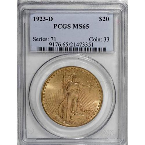 <B>1923-D $20 MS65 PCGS.</B></I> PCGS Population (1842/1341). NGC Census: (1532/844). Mintage: 1,702,250. Numismedia Wsl. Price for NGC/PCGS coin in MS65: $1,275. (#9176)<BR><BR><B>Coin Engraver:</B> Augustus Saint-Gaudens<BR><BR><b>Shipping:</b> Coins & Currency (<a target="_blank" href="http://www.heritageauctions.com/common/shipping.php">view shipping information</a>\)