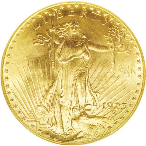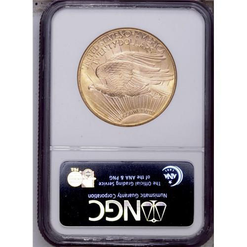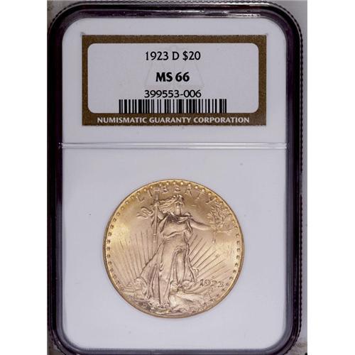 <B>1923-D<$20> MS66 NGC.</B></I> Boldly struck with a bright satiny sheen and delightful straw-gold coloration with reddish accents on each side. The few tiny surface marks are not a factor in the grading or the eye appeal of the piece. A popular Denver Mint issue known for its consistently pleasing appearance. <BR><BR><B>Important