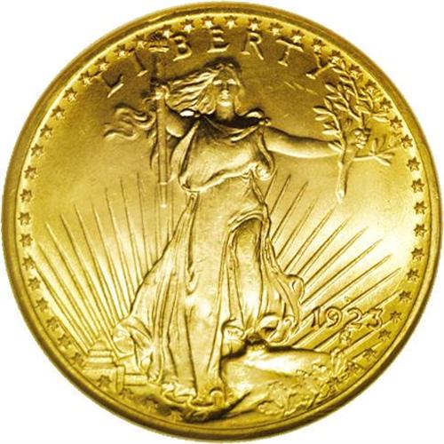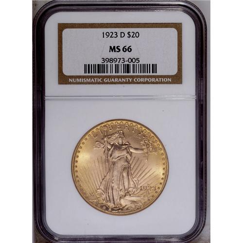 <B>1923-D $20 MS66 NGC.</B></I> A popular Denver Mint issue known for its consistently pleasing appearance, this Gem specimen certainly lives up to those expectations. Coruscant luster overall with rich golden patina.