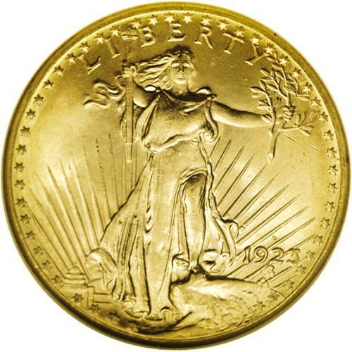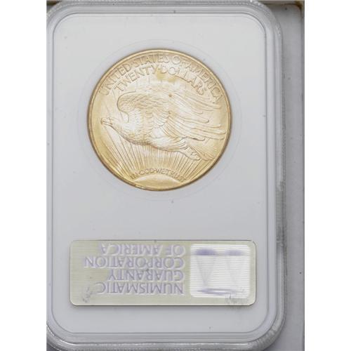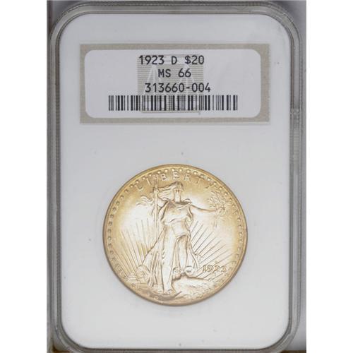 <B>1923-D<$20> MS66 NGC.</B></I> Areas of bright copper-gold and deep antique-gold illuminate the surfaces of this fresh piece. The strike is bold, with excellent detail to the face, knee, hands, and breast feathers. This coin lives up to the flashy reputation of the quality of Denver Double Eagles of this date.