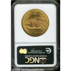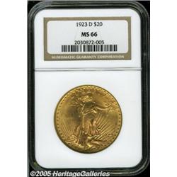<B>1923-D $20 MS66 NGC.</B></I> Fully struck and highly lustrous, the reddish-golden surfaces exhibit just the slightest accent of lime-green patina on each side (primarily on the reverse, though). While not exactly rare, the 1923-D is not generally thought of as a type coin as a 1924 or 1927, but for just a bit more the type collector can have a 1923-D and a coin of unsurpassable beauty.