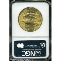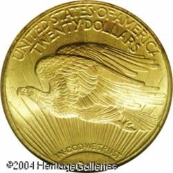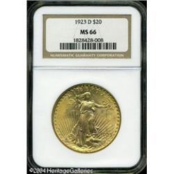 1923-D $20 MS66 NGC. Highly lustrous and well defi <B>1923-D $20 MS66 NGC.</B></I> Highly lustrous and well defined overall with a pronounced green-gold cast. A few scattered bagmarks are noticed mostly on the eagle's feathers. <BR><BR><B>Important notice:</B> Heritage usually auctions material at the rate of 200-250 lots per hour. On some occasions eBay Live bid software or the Internet may not be able to keep up with the pace of the auction. We recommend placing a realistic absentee bid now as insurance to avoid disappointment. Occasionally the auctioneer may eliminate or reject an eBay Live bid, and the auctioneer may also reopen a lot after the close of the eBay live bidding (usually because we missed an audience bid), and may reject your bid even if it shows you as the winning bidder. By bidding via eBay Live, you agree that Heritage may award the lot to another bidder at its sole discretion under the circumstances described above or any other reasonable circumstances. Since eBay bids are not shown to us until we open the lot on the floor, we treat those bids just like floor bids. In most cases the floor responds before the eBay bid is presented to us, due to Internet lag time, so for consistency we have made it a policy that floor bids are always considered first over tie eBay live bids. Also please note that all Heritage lots purchased through eBay Live carry a 20% Buyer's Premium. Please make sure you read the Terms and Conditions before you bid. This lot is being auctioned in conjunction with a live floor auction by Heritage Galleries & Auctioneers. All final auction and invoice information will be supplied by Heritage Galleries & Auctioneers, and all other information should be considered preliminary. Lot:7195