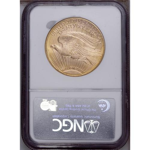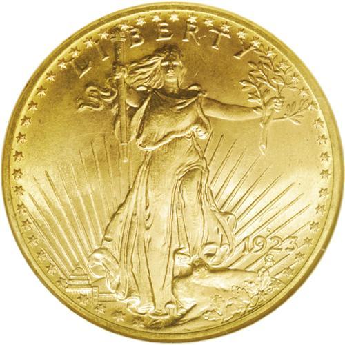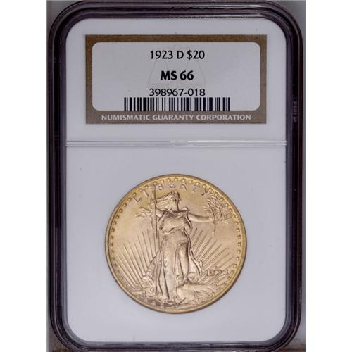 <B>1923-D $20 MS66 NGC.</B></I> Sharply struck and highly lustrous with exquisite pinkish-gold luster and satiny surfaces. This is a splendid example for the specialist, or the type collector. The '23-D is one of the most common Saint-Gaudens double eagles, and it is certainly the single most plentiful issue from the Denver Mint.
